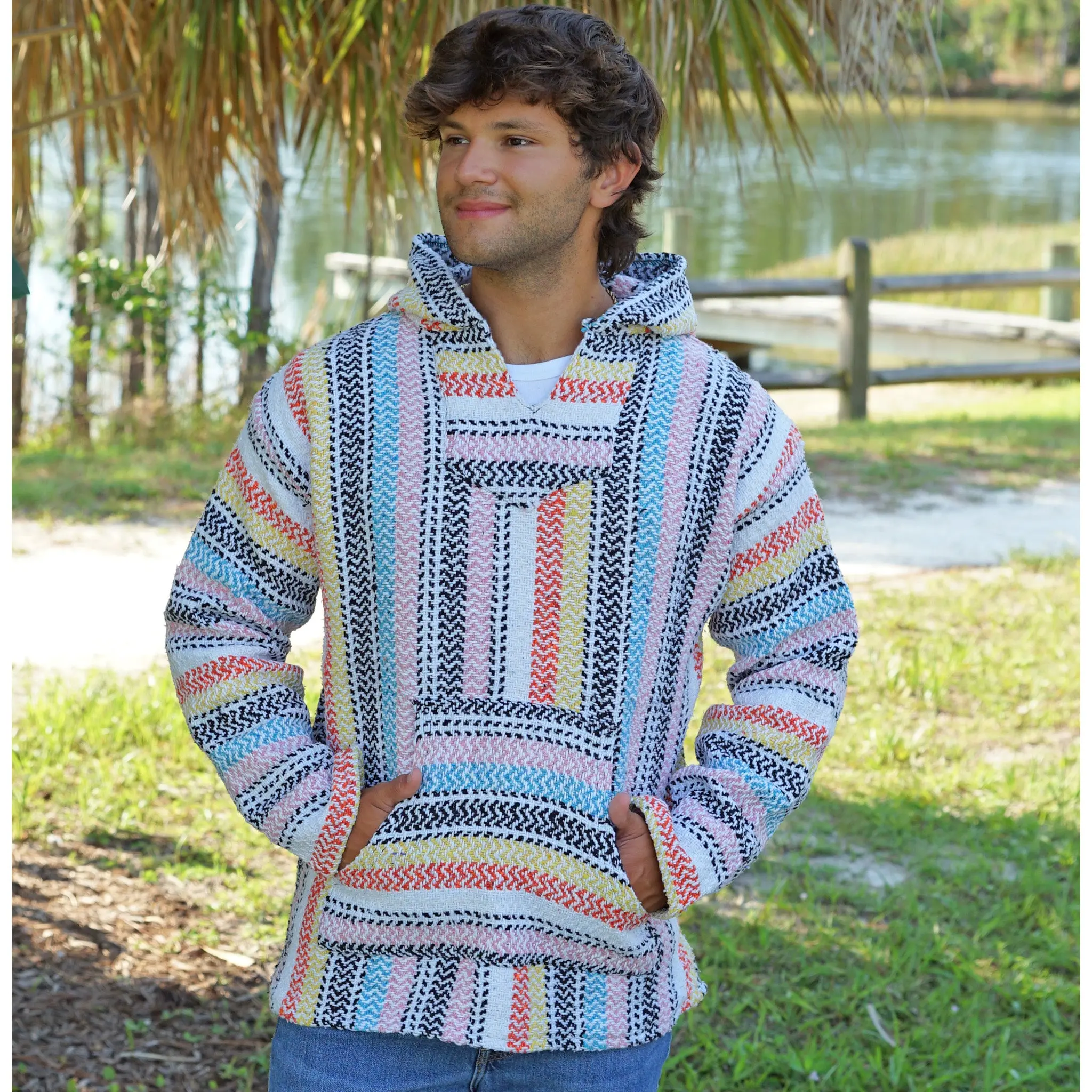 The classic stripe baja gets a modern color update! Whether you call it a Baja, Jerga, or Drug Rug, this is an essential item for all hippies. Super comfy and loose fitting with multi-shaded pastel stripes of pink, yellow and aqua combined with black and white makes this hoodie the perfect combination for a down to earth look. Our baja has a hood and large front belly pocket, making it warm yet breathable, made with 100% recycled eco-yarns so they are environmentally and vegan friendly.